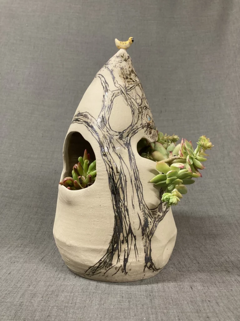 Ode au végétal et au féminin, hymne à la nature, ces vases céramiques trouvent leur présence dans la verticalité. Dans le rêve, la puissance du trait de l’artiste et l’intériorité exprimée, ces oeuvres de grès, gravées puis colorées par touches à l’émail, viennent attraper le regard de celle ou celui qui entre dans leur espace et leur énergie. Méditer, danser, se recueillir et jouer avec les formes.