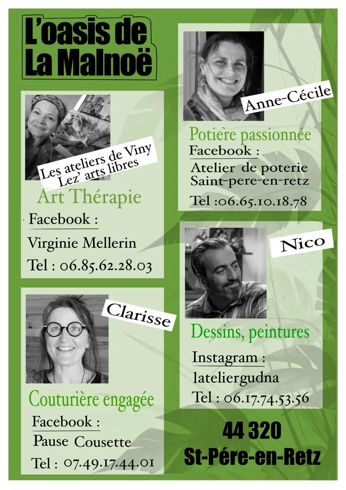 Notre collectif d’artistes-artisanes s’est associé aux propriétaires des lieux de la Malnoë pour former l’Oasis de la Malnoë ! Notre Fête de la Malnoë s’est déroulée pour la première édition, le 20 septembre 2025. Le franc succès de cette journée (1800 visiteurs intéressés), nous invite à penser que vous avez été conquis par la dynamique de ce lieu particulièrement ressourçant ! L’énergie de création y règne : céramique, peinture, dessin, couture ou art-thérapie, mais aussi le partage, le sens du collectif et du -bien-être, sans oublier le lien à la nature dans cet environnement bucolique de la petite commune de Saint-Père en Retz. Le projet de l’Oasis de la Malnoë s’inscrit dans ce développement des liens humains et environnementaux : co-construire notre avenir d’artistes-artisans professionnels céramistes, peintres ou couturière, au sein d’un village qui a du coeur !