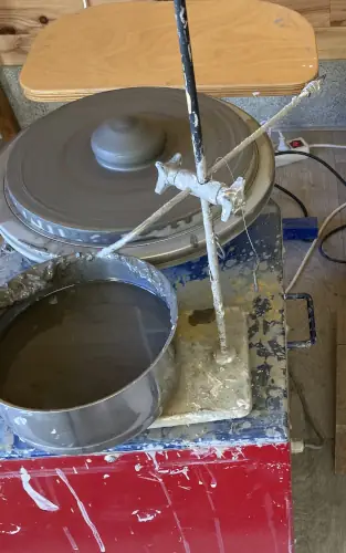 La poterie à proprement dite, l’élaboration d’un contenant, se forme par rotation : boule au creux de la main, boule pincée, étirée, façonnage aux colombins, prévigurent le tour. Cette première machine humaine, la roue, assure cette rotation et libère les deux mains. J’ai appris le tournage sur un tour à pied, c’est-à-dire avec un volant de giration ou une pédale pour l’entraîner. Aujourd’hui, le tour électrique a trouvé sa place dans l’atelier de poterie et remplace l’énergie des jambes. Il n’en reste pas moins que l’essentiel de la maîtrise du tournage potier se situe dans la respiration ! Le centrage de l’argile sur le tour, étape primordiale et incontournable, ne se fera qu’à condition de recentrage sur soi et d’écoute attentive de sa respiration.